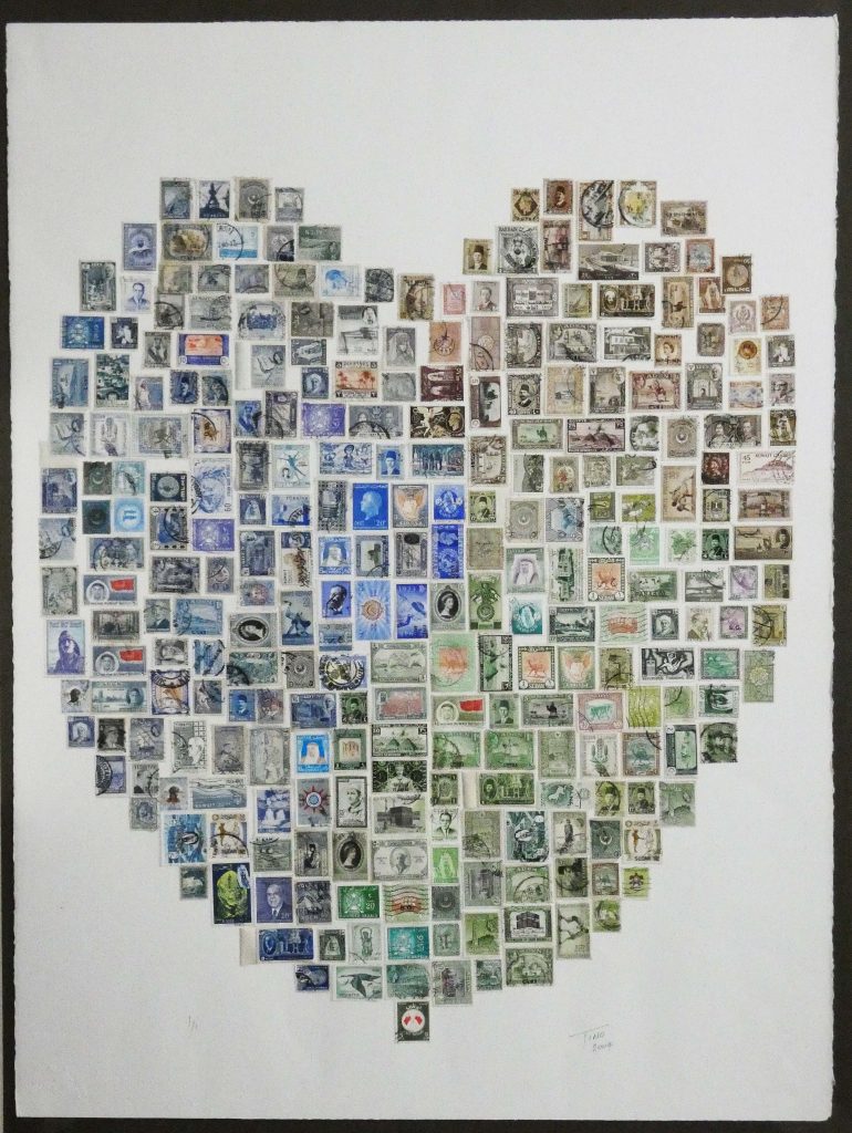 Created as a focal piece of stamp artwork using stamps from around the world. Working in pastel tones and deep shades The Green Heart is a personal expression of the way the artist felt people would connect with the meaning of ‘Hearts’. By Tino