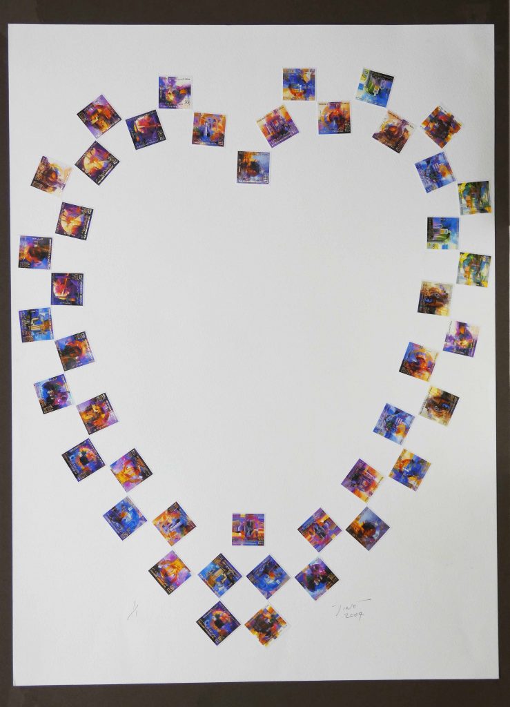 Created as a support piece of stamp artwork using stamps from around the middle east, renowned for the spirit of Heart. Working with high quality pictorial thematic stamps displaying the rich colours of the heart. The Love of Hearts is a personal expression of the way the artist felt people would connect with the deep sense of emotion evoked by images of ‘Hearts’.