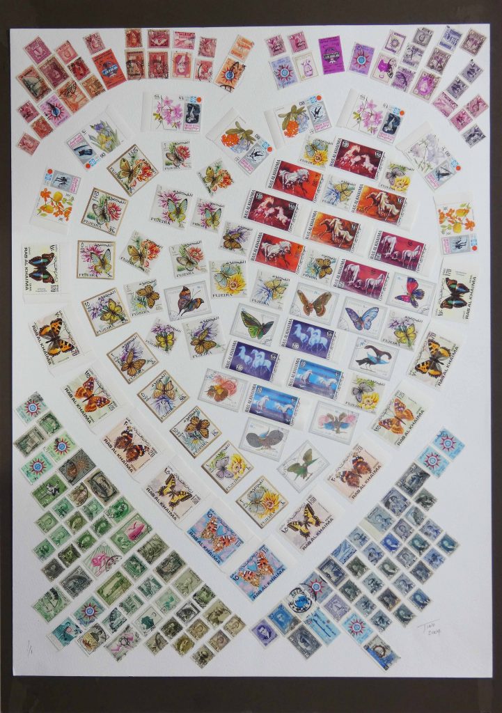 Created as a support piece of stamp artwork using stamps from around the world and middle east, renowned for the spirit of Heart. Working with high quality pictorial thematic stamps displaying butterfly’s and horses in shades of reds, yellow, green and blue, blended with pastel stamps to surround the heart.