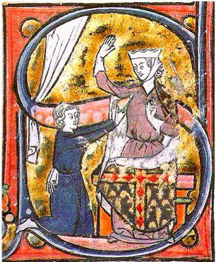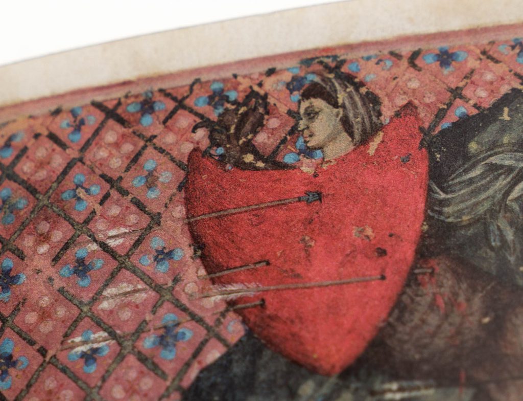 The first known depiction of a heart as a symbol of romantic love dates to the 1250s. It occurs in a miniature decorating a capital ‘S’ in a manuscript of the French Roman de la poire (National Library FR MS. 2086, plate 12). In the miniature a kneeling lover (or more precisely, an allegory of the lover’s “sweet gaze” or douz regart) offers his heart to a damsel. The heart here resembles a pine cone (held “upside down”, the point facing upward), in accord with medieval anatomical descriptions. However, in this miniature what suggests a heart shape is only the result of a lover’s finger superimposed on an object; the full shape outline of the object is partly hidden, and therefore unknown. Moreover, the French title of the manuscript that features the miniature translates into “Novel Of The Pear” in English. Thus the heart shaped object would be a pear; the conclusion that a pear represents a heart is dubious. Opinions therefore differ over this being the first depiction of a heart as symbol of romantic love. Giotto in his 1305 painting in the Scrovegni Chapel (Padua) shows an allegory of charity (caritas) handing her heart to Jesus Christ. This heart is also depicted in the pine cone shape based on anatomical descriptions of the day (still held “upside down”). The convention of showing the heart point upward switches in the late 14th century and becomes rare in the first half of the 15th century.