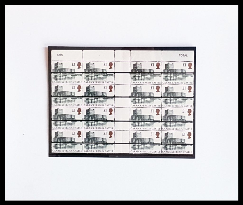 The Carrickfergus ‘Green’ Castle project comprises of a unique variety of printers finisher marks with errors of the high value GB £1 Carrickfergus Castle blocks which are very scarce in blocks. They comprise a stamp art presentation of works never seen in exhibition or display for the public to enjoy.
