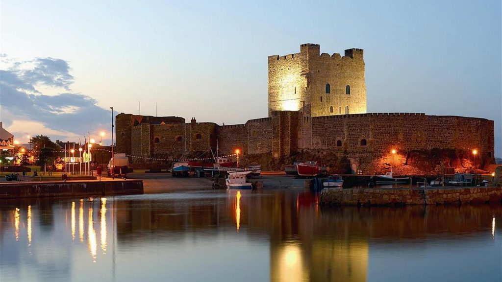 Carrickfergus Castle (from the Irish Carraig Ḟergus or “cairn of Fergus”, the name “Fergus” meaning “strong man”) is a Norman castle in Northern Ireland situated in the town of Carrickfergus in Count Antrim, on the northern shore of Belfast Lough. Besieged in turn by the Scottish, native Irish, English and French, the castle played an important military role until 1928 and remains one of the best preserved medieval structures in Northern Ireland. It was strategically useful, with 3/4 of the castle perimeter surrounded by water.