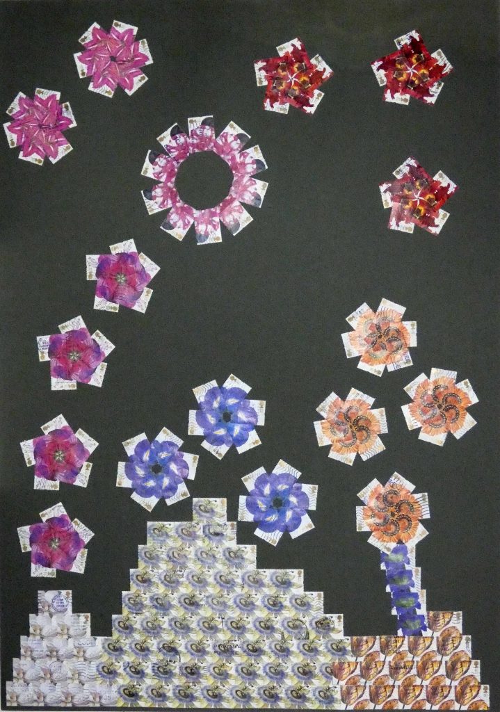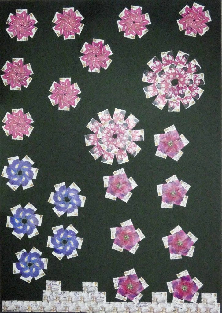 Created as a focal piece of stamp artwork using stamps from the 1997 GB issue of 19th Century Flower Paintings. Working with the patterns of the stamps to form flowers and pollen, displaying the versatility of using postage stamps to convey the message of art. By Tino