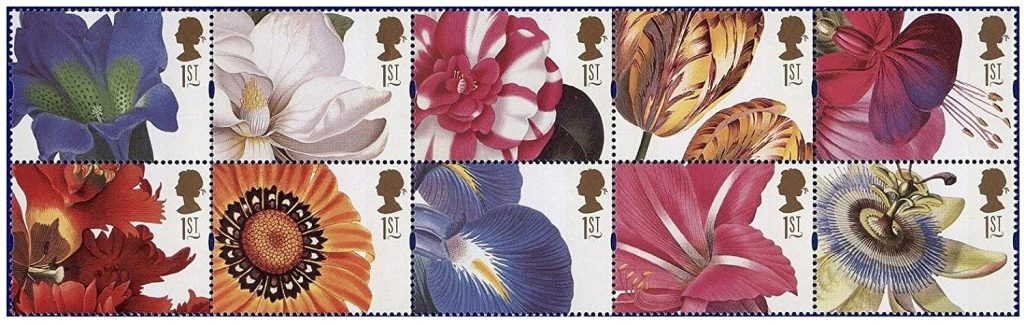 To celebrate British flowers, the Royal mail issued the 1997 Greetings Flowers issue of 19th Century Flower Paintings to celebrate botanical art in all its glory. The paintings by Georg Ehret, Alfred Chandler, Augusta Withers, Charlotte Sowerby and Pierre-Joseph Redoute included the flowers: