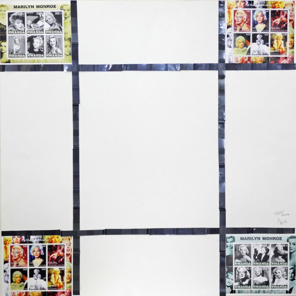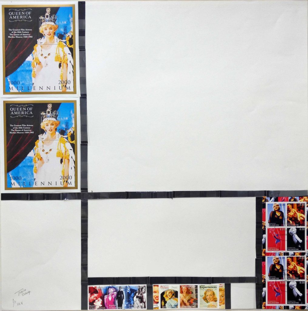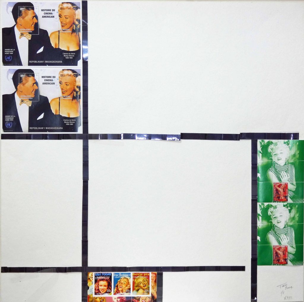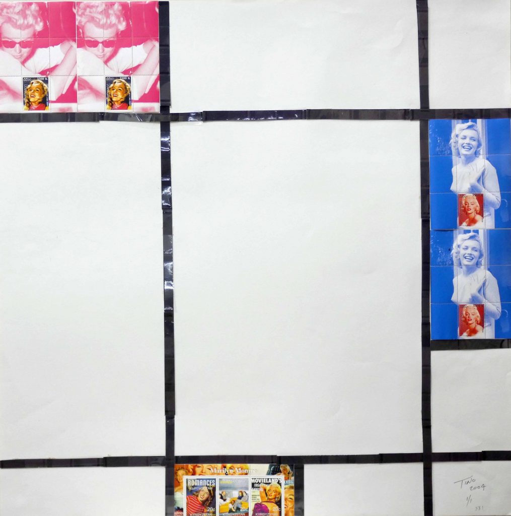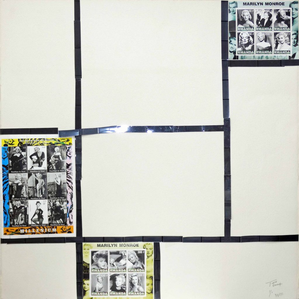 The Stamp Art 2004 Mondrian ‘Thematic’ project focus’s on icons and artists of the 20th Century. The mention of Marilyn Monroe immediately connects with most people. Shown in the Mondrian project as the focal icon with all rules barred against a backdrop of abstract art using postage stamps and thematic from around the world in the pop art culture.