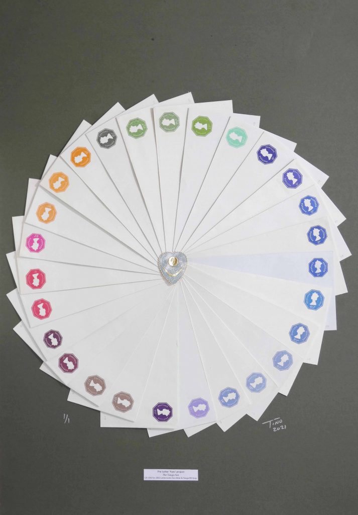 “The Little ‘L’ Fan, Thus Little L – L Fan Art is artwork created using Mint Condition letter card issues, displayed as fans from a work of fiction or derived from a series character or other aspect of that work. Fan artworks can take many forms. Stamp Art presents works of artistic representations using letter cards, displayed in layouts of fans in new contexts”. By Tino