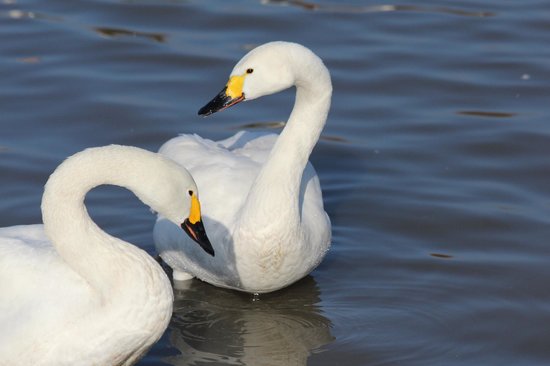 Bewick swans have more oval, rounded yellow patches on either side of their bill. They are the smallest swan species to visit the UK, not very much bigger than a Canada goose. Their calls are more reminiscent of an excited dog. The yellow on a whooper swan’s bill forms a pointed ‘v’ shape on either side. They are bigger birds than Bewick’s swans and have a honking voice which can sound like an old-fashioned car horn!