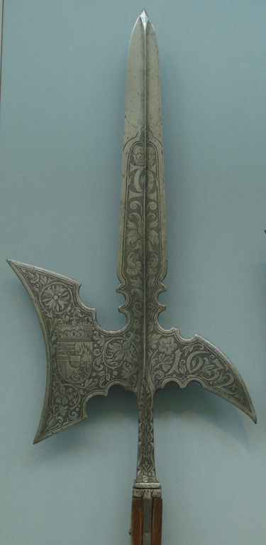 The halberd head––consisting of an axe blade with strongly concave cutting edge, a wide double-edged thrusting blade with strong mid-ridge, and a down-curved apical beak––is almost completely covered with etched decoration. On one side of the axe blade is etched the arms of the Princes Liechtenstein, and on the other an oval medallion with the emblem of a hammer-wielding hand striking a pointed anvil, the personal device of Carl Eusebius (1611–1684), Prince of the Empire and Regent of the House of Liechtenstein, and the inscription VIRTUTE ELUDITUR ICTUS (“Through virtue he eludes the blow”).