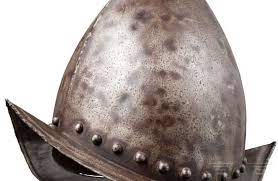 Morian (helmet)A morion (Spanish: morrión) is a type of open helmet originally from theKingdon of Castile (Spain),used from the beginning 16th to early 17th centuries, usually having a flat brim and a crest from front to back. Its introduction was contemporaneous with the exploration of North, Central and South America. Explorers such as Hernando de Soto and Coronado may have supplied them to their foot soldiers in the 1540s.