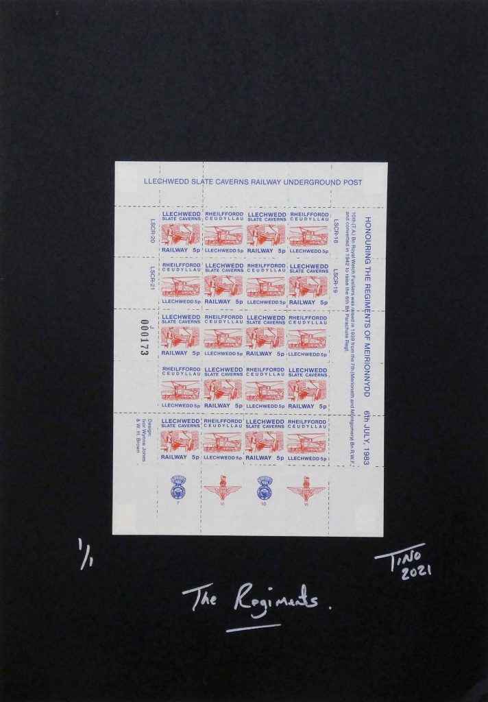 GB LLECHWEDD SLATE CAVERNS RAILWAY stamps. Presented as the original sheets of issue, in ‘Fine Mint’ condition, with printers colours and numbering 000173, Honouring The Regiments of Meirionnydd 6th July 1983 ‘The Regiments’, Very Rare and collectable.