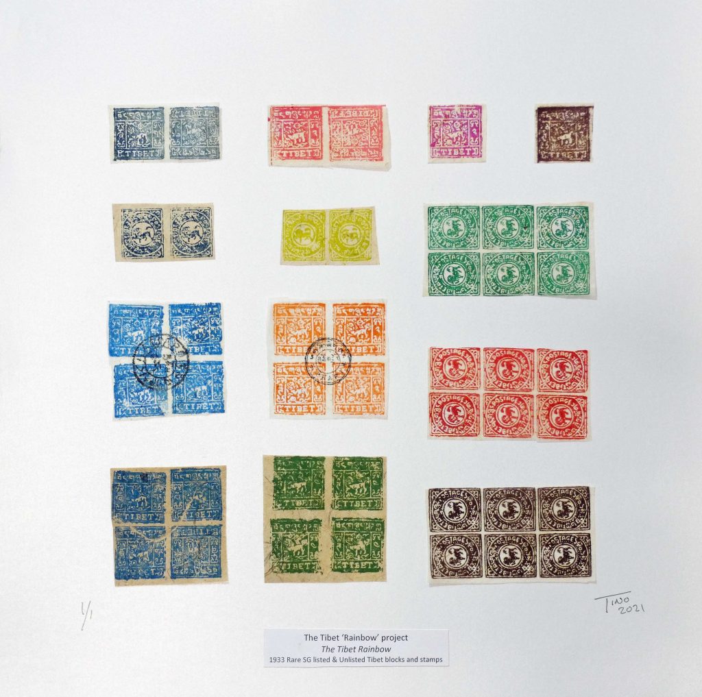 The Stamp Art Tibet ‘Rainbow’ project using the 1933 Tibet postage stamps, blocks and varieties – Rare Mint & Used. The showcase, presents an infomative and educational review of Artwork Layouts including the Tibet blocks and stamps with a number of ‘Limited Edition’ Fine Artwork prints are available for sale in the Stamp Art Gallery Shop.